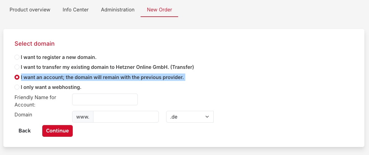 If you want to keep the domain at the current registrar and just host it on Hetzner, you will have to select the option "I want an account; the domain will remain with the previous provider." and make the basic configuration. The Friendly Name is basically an internal label, so you can identify the account among other projects you may have and the Domain is self-explanatory.