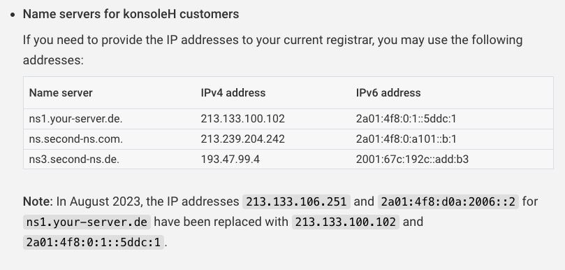 Now comes the hard part: configuring the nameservers on the registrar's page. I had to dig a little for the addresses but with a little google-fu I eventually found them on this Hetzner DNS Overview Help page: