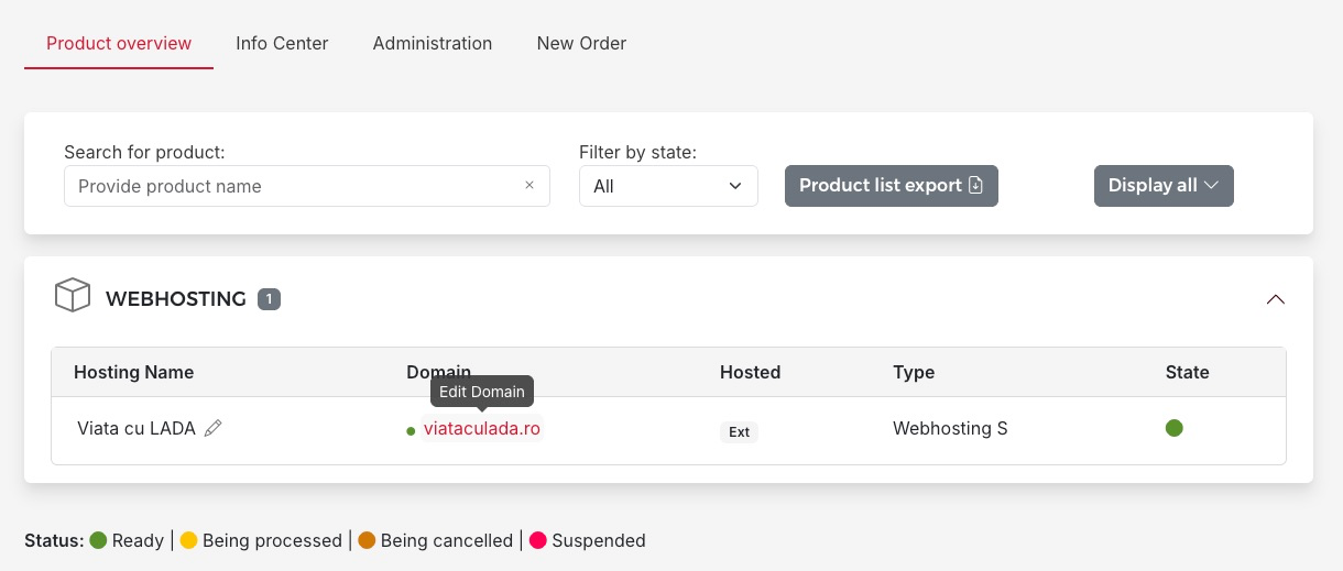 By default you will see the Web hosting options, the ones that allowed you to easily install Wordpress. In order to add the certificate, you will have to click on the domain name, from the listing page