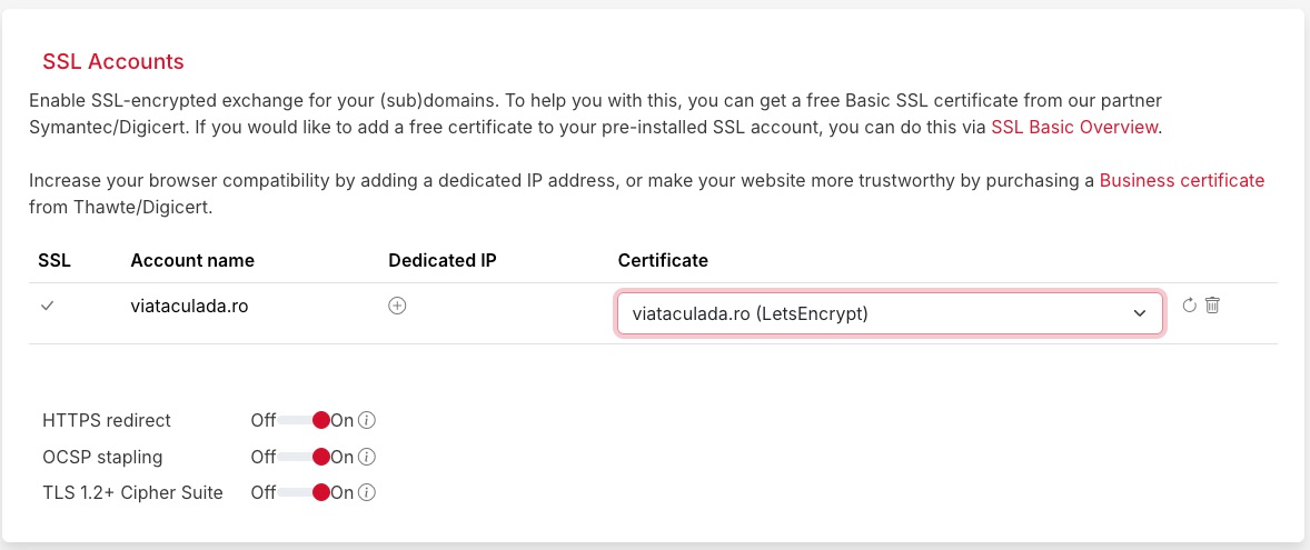 From this screen, select the LetsEncrypt option in the Certificate dropdown and then click on the refresh icon in the right (that part was not intuitive at all). In the end, don't forget to toggle on the automatic HTTPS redirect (by default it's off)